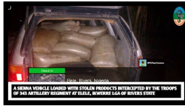 Elsewhere in Elele Town, Ikwerre LGA, a Sienna vehicle loaded with 32 sacks containing approximately 1,920 litres of stolen AGO was apprehended. Troops also discovered a pit with over 1,200 litres of condensate, an illegal connection point, and seized three 150-meter-long hoses, eight metal drums, and several ovens used for refining.