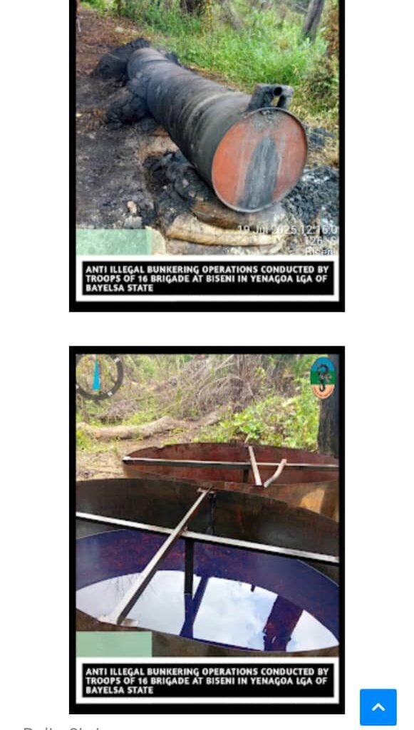 At Biseni, Yenagoa LGA, troops dismantled four illegal refining sites and four dug-out pits. More than 10,000 litres of stolen AGO were confiscated, and five cooking ovens destroyed. Search operations continue in nearby creeks to locate other criminal hideouts.