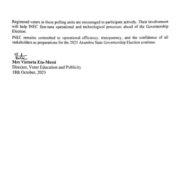 As part of its preparations, INEC will also conduct a Mock Accreditation Exercise on Saturday, 25th October 2025, across selected polling units in the three senatorial districts of Anambra State. The exercise is designed to test the upgraded Bimodal Voter Accreditation System (BVAS), evaluate its response time, and assess the uploading of results to the INEC Result Viewing (IReV) Portal ahead of the main election.