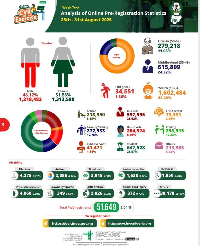 The Independent National Electoral Commission (INEC) has announced significant progress in the ongoing nationwide Continuous Voter Registration (CVR), with over 2.6 million Nigerians registering both online and in-person within the first two weeks of the exercise.