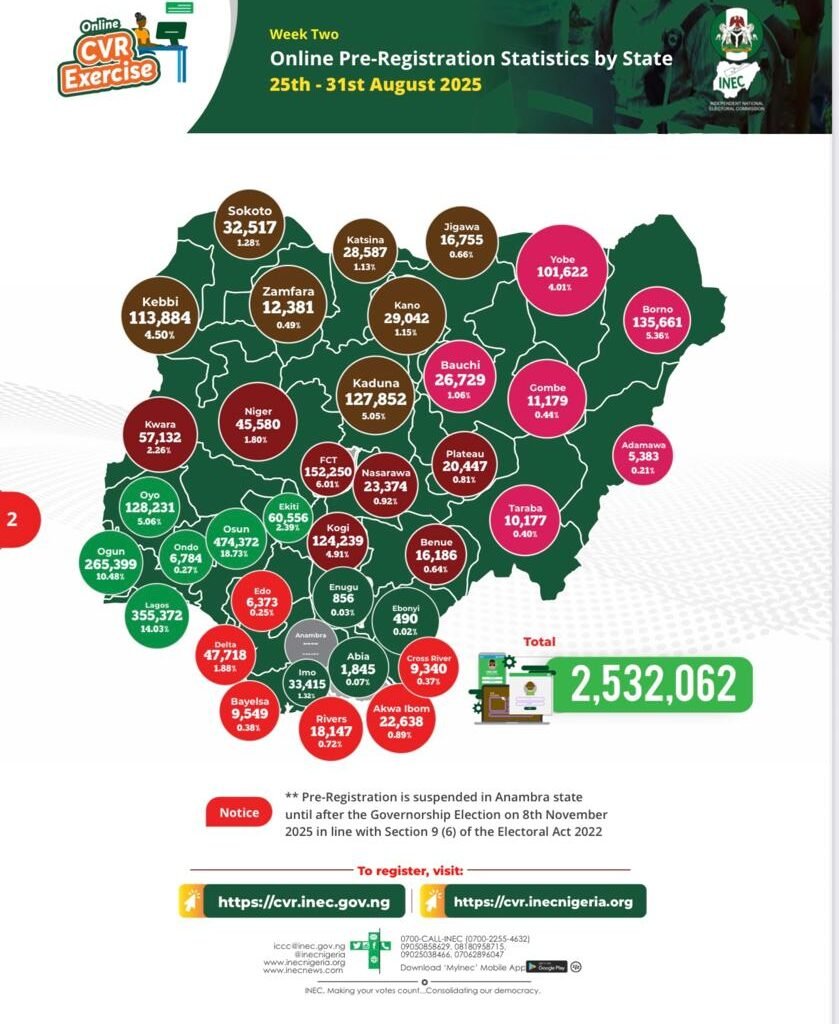 According to a statement by Sam Olumekun, National Commissioner and Chairman of INEC’s Information and Voter Education Committee, the online pre-registration exercise, which began on Monday, 18th August 2025, has already attracted 2,532,062 applicants as of Sunday, 31st August 2025.