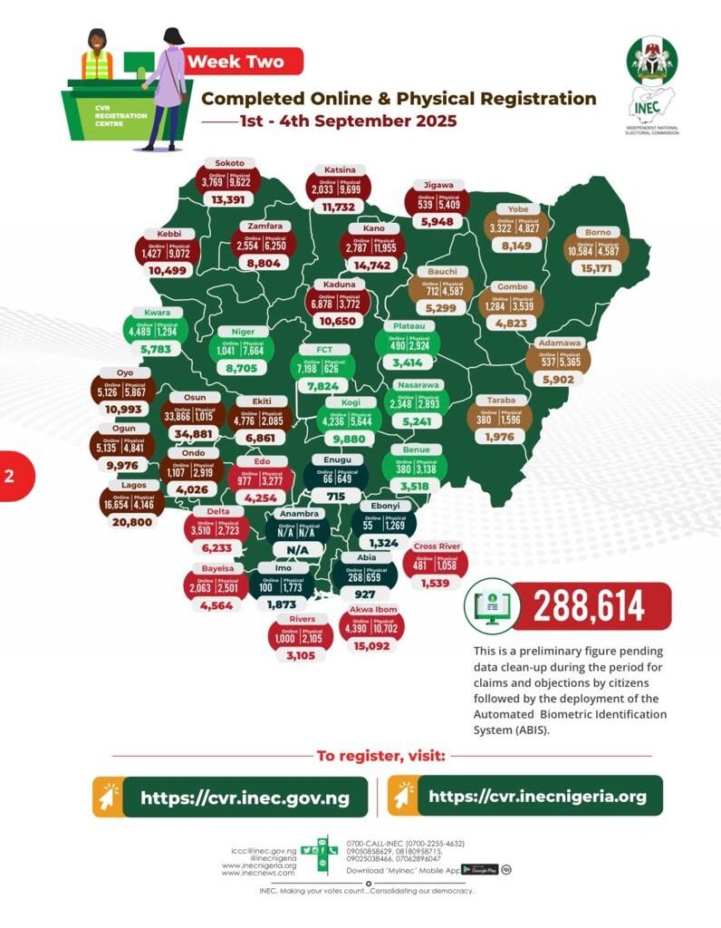 Abuja, September 8, 2025 – The Independent National Electoral Commission (INEC) has released its latest update on the ongoing nationwide voter registration, recording impressive figures from both the online and physical registration processes.