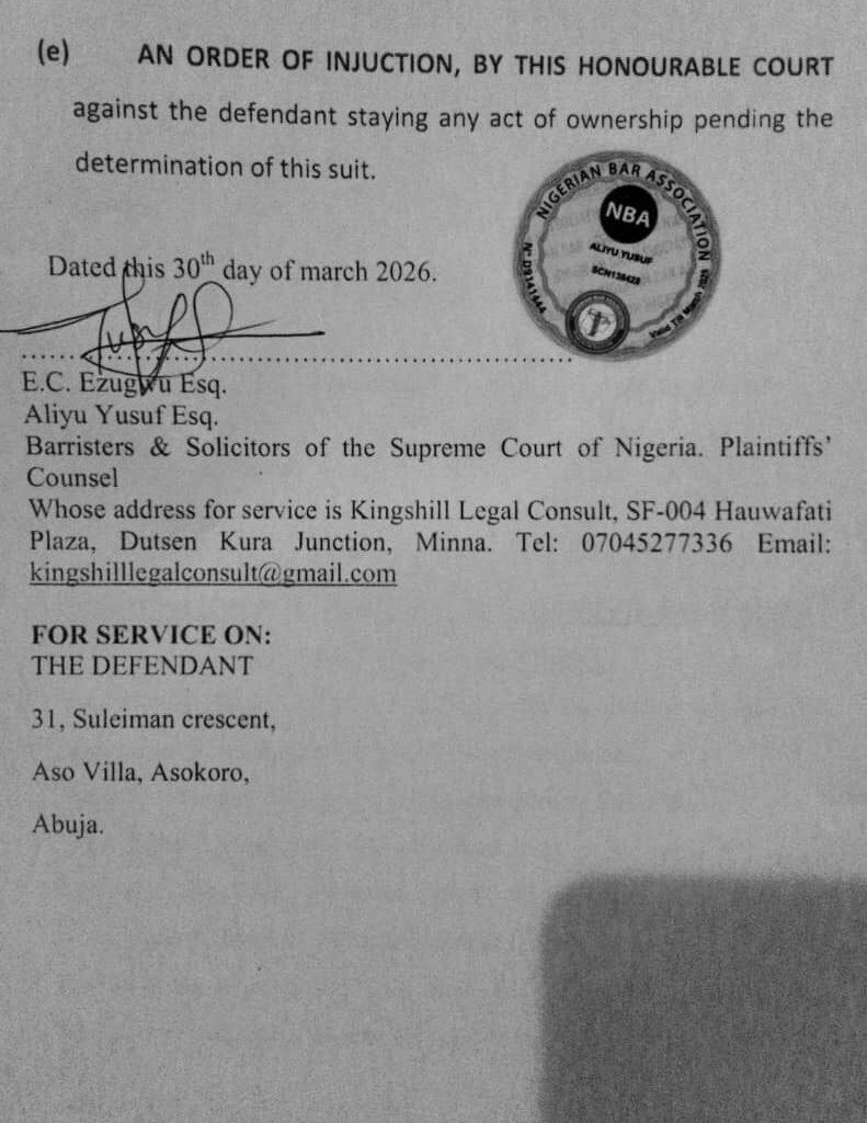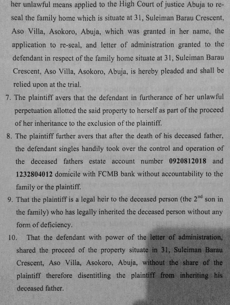 He further claimed that the family residence located at No. 31, Suleiman Barau Crescent, Asokoro, Abuja, was re-sealed and allocated to the defendant’s exclusive use, thereby denying other heirs access to the property.