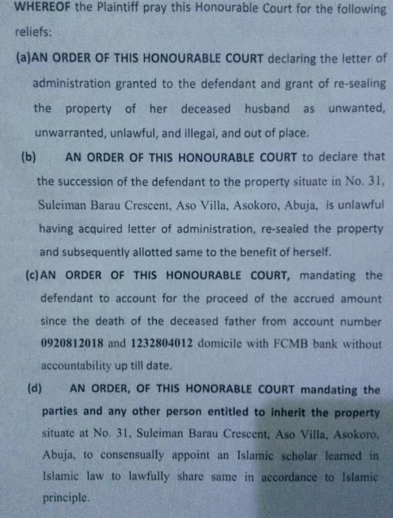 He also urged the court to compel all parties to jointly appoint a qualified Islamic scholar to oversee the equitable sharing of the property, particularly the Asokoro residence.