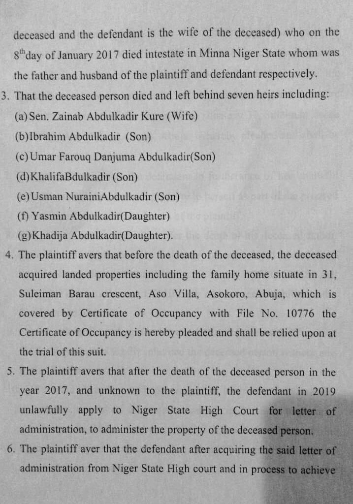 The listed beneficiaries of the estate include the widow, Senator Zainab Abdulkadir Kure, four sons Ibrahim, Umar Farouq, Khalifa, and Usman Nuraini and two daughters, Yasmin and Khadija.
