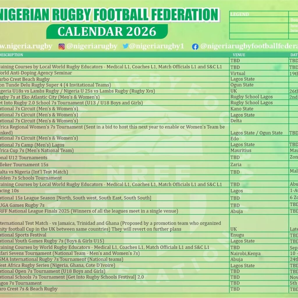 The Nigeria Rugby Football Federation (NRFF) has released its 2026 calendar of activities, outlining an expanded domestic competition structure and a renewed focus on strengthening women’s rugby at the continental level.