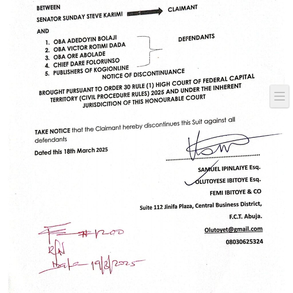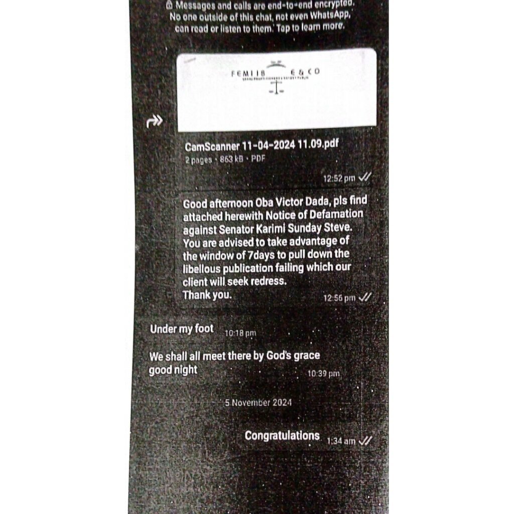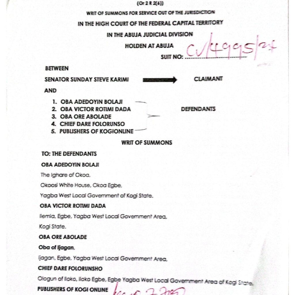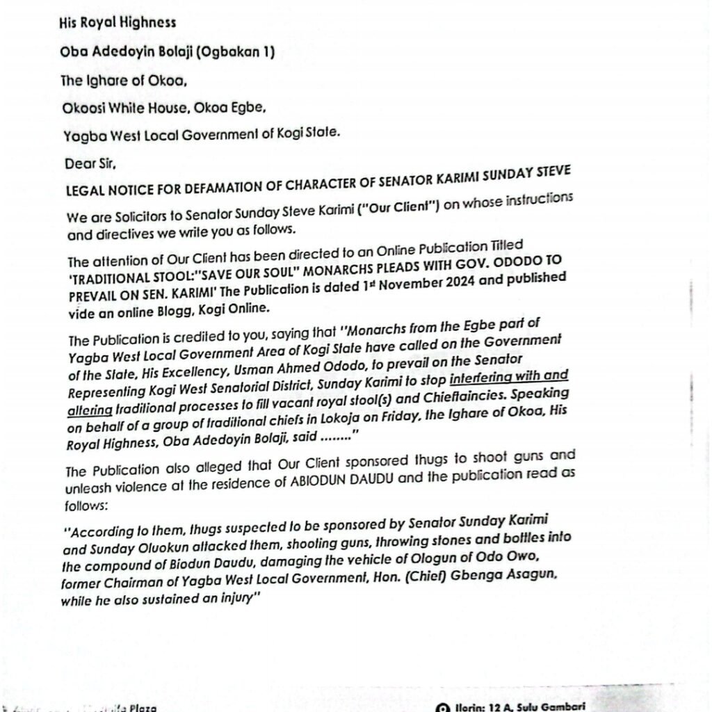 He further referenced an online publication titled “Traditional Stool: Save Our Soul, Monarchs Plead with Gov Ododo to Prevail on Sen. Karimi,” which alleged that the senator interfered in traditional processes, backed a candidate, and sponsored violent attacks against some chiefs.