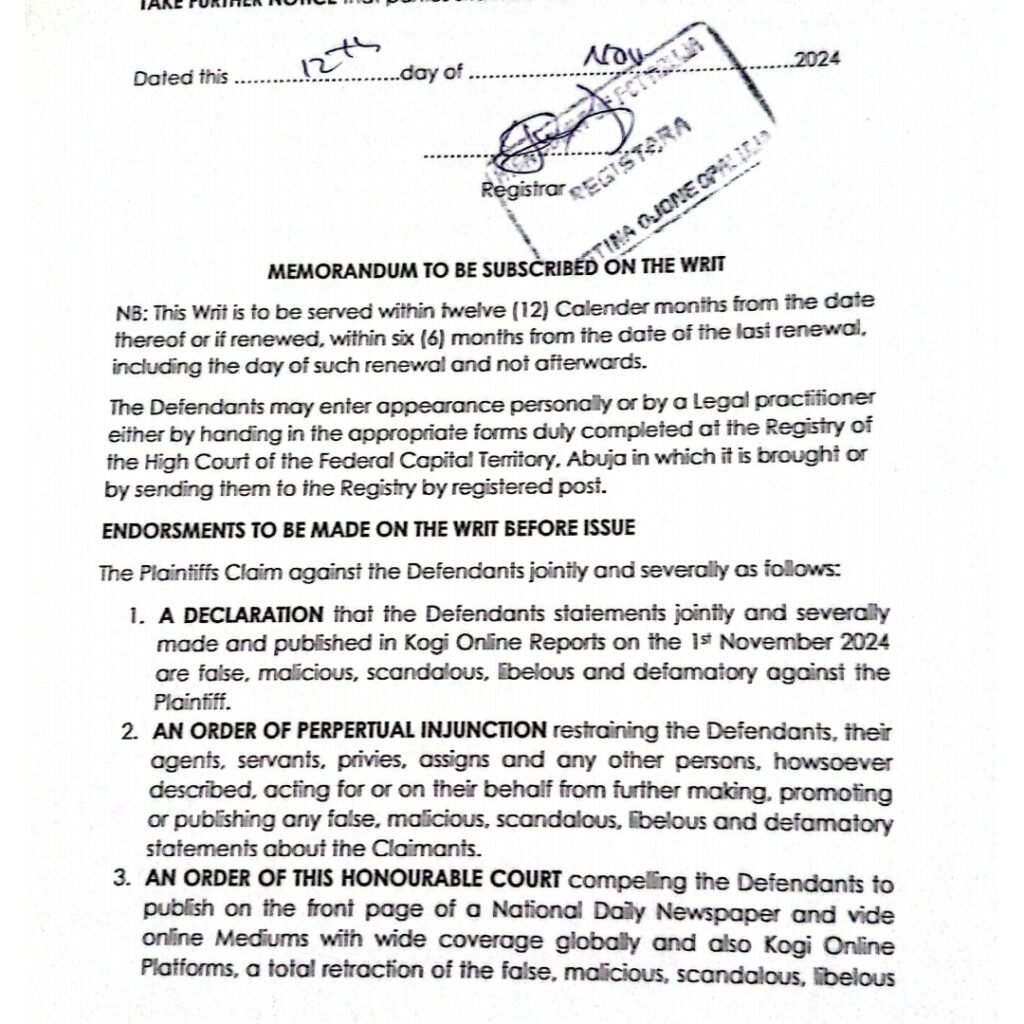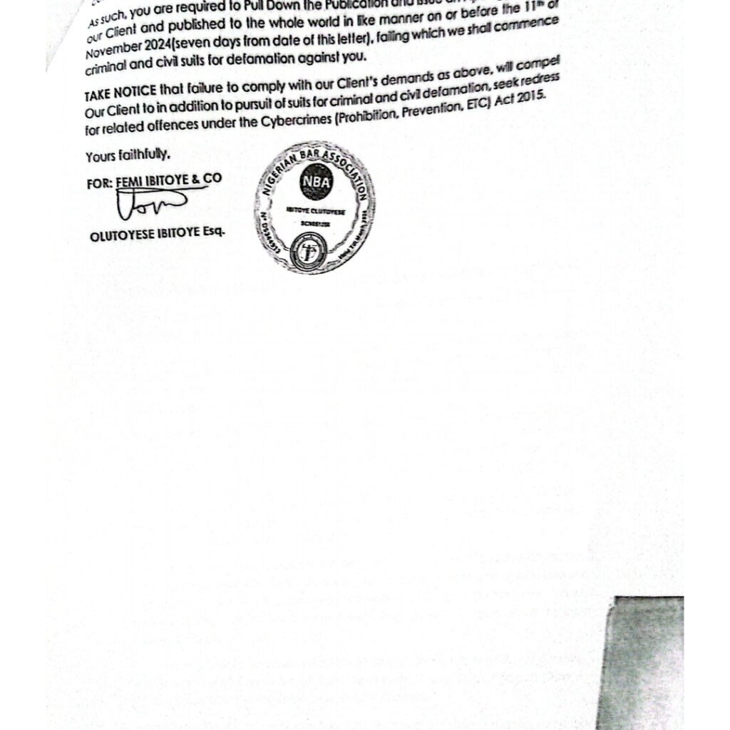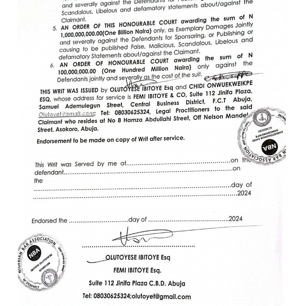 Subsequently, a civil suit (CV/4995/24) was filed at the High Court of the Federal Capital Territory on November 12, 2024, seeking the removal of the publication, an apology, and damages.