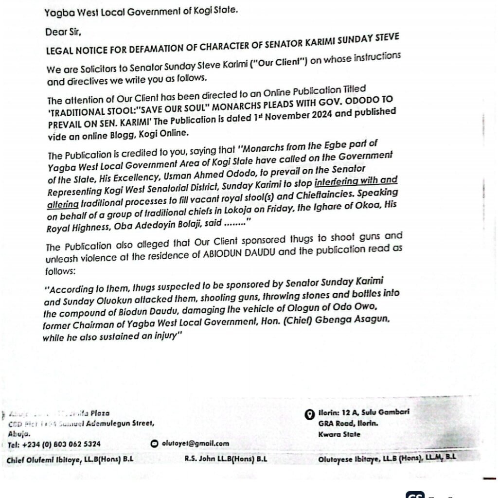 A legal practitioner, Olutoyese Ibitoye, has come to the defence of Senator Sunday Karimi, dismissing allegations by some traditional rulers in Egbe, Kogi State, as false, misleading, and defamatory.