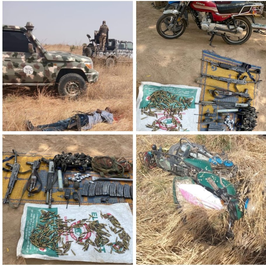 The statement added that a follow-up pursuit and exploitation of the area led to the recovery of a cache of arms and logistics, including three AK-47 rifles, one pump-action rifle, five motorcycles, two hand grenades, two Baofeng radios, 12 AK-47 magazines, a rocket-propelled grenade charger, detonation cords, batteries, bandoliers, camel bags, iron bars, and other IED-making materials.